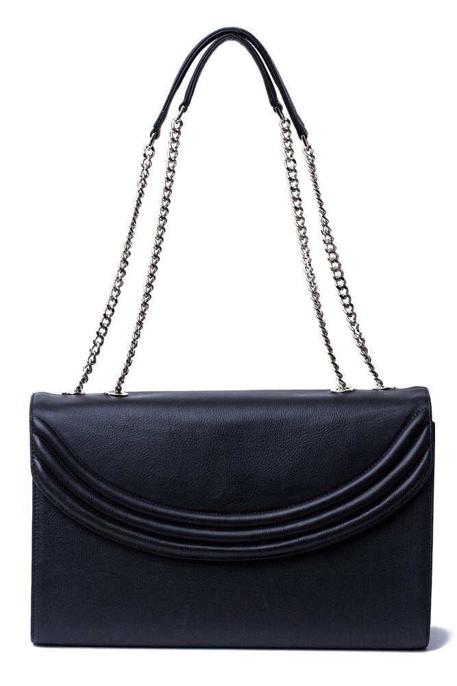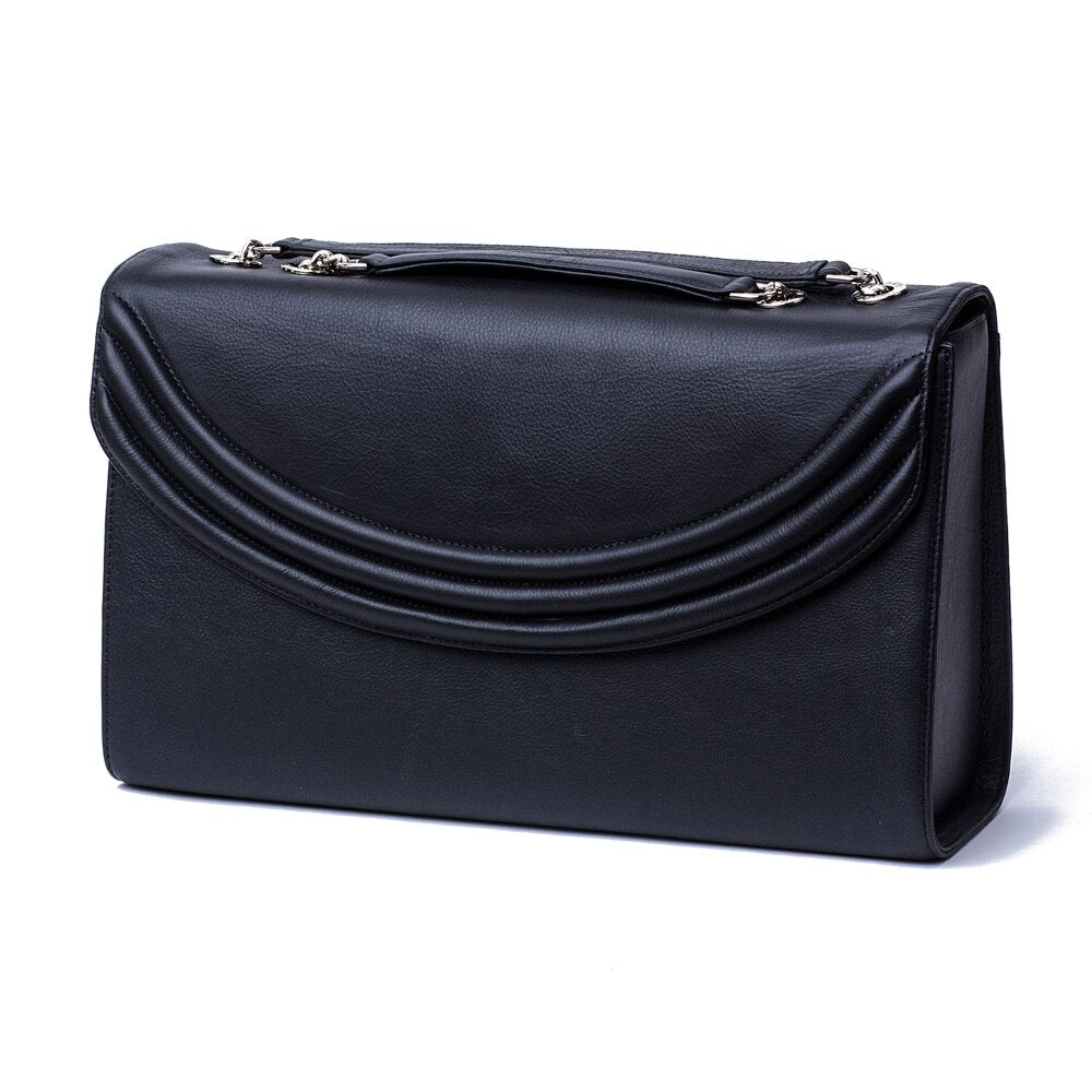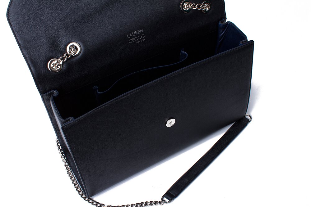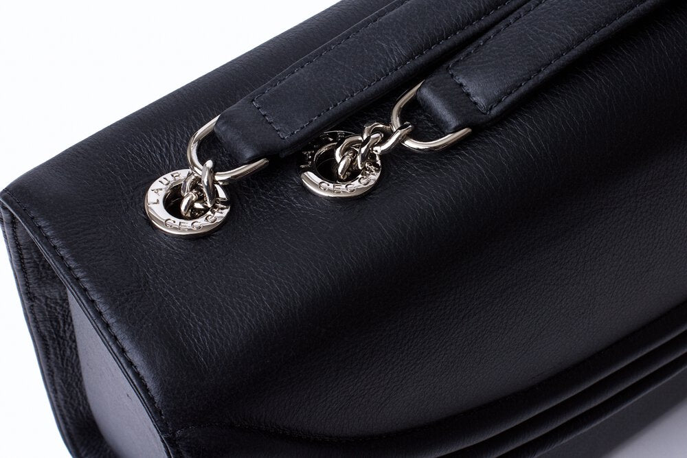 Be ready for your next black tie event with the Black Luxe by Lauren Cecchi New York. Featuring demure brand ribbing on a decidedly classical design, this sophisticated handbag is the perfect dance between style and purpose. Enjoy a 40-inch polished silver chain with protective leather shoulder straps. Get carried away by the ample storage space and luxurious Italian leather finish. Create a look that is the cream of the crop with the American-made Black Luxe.