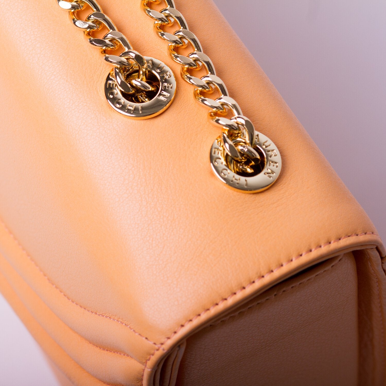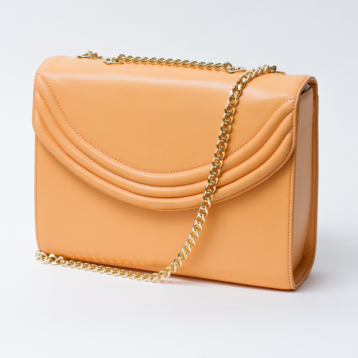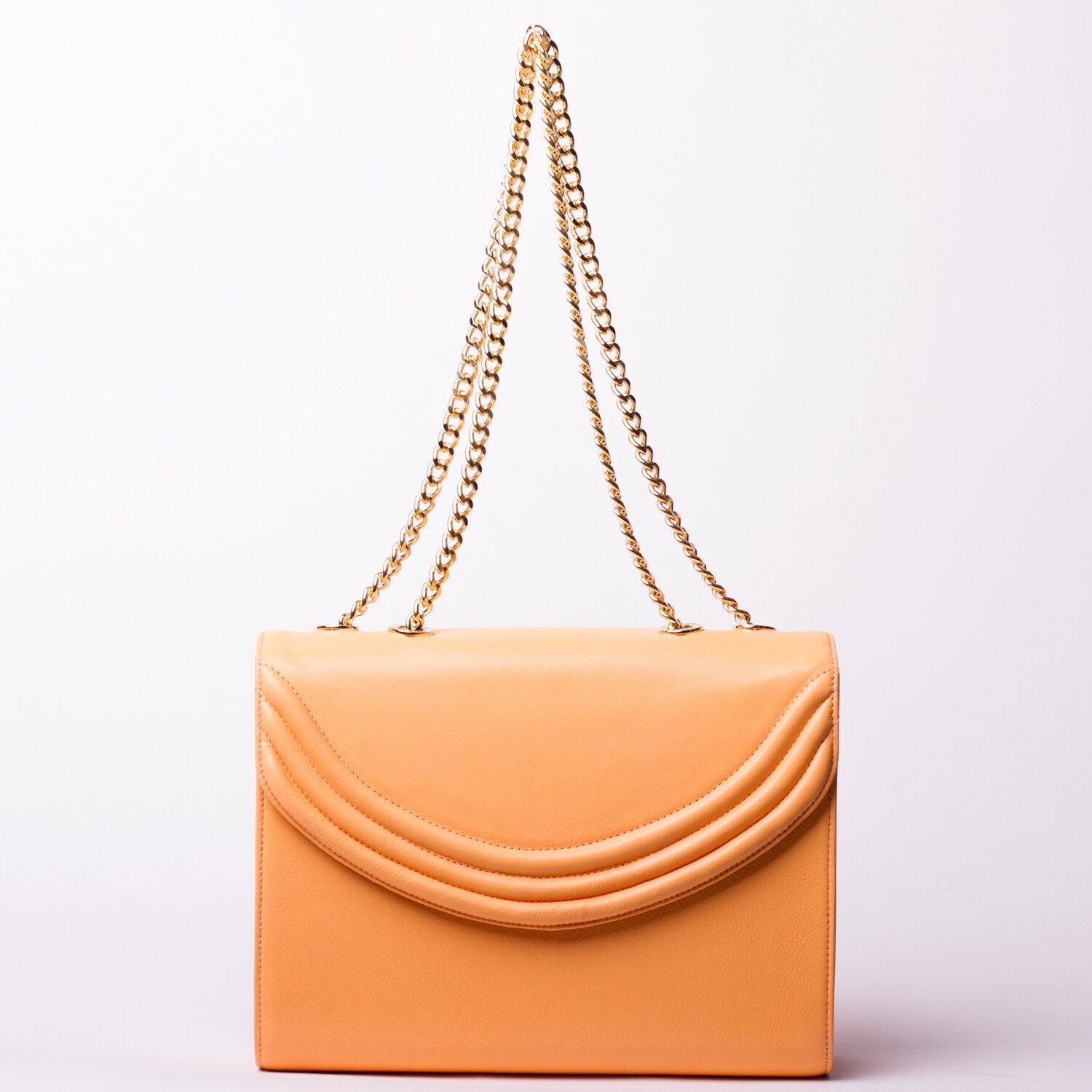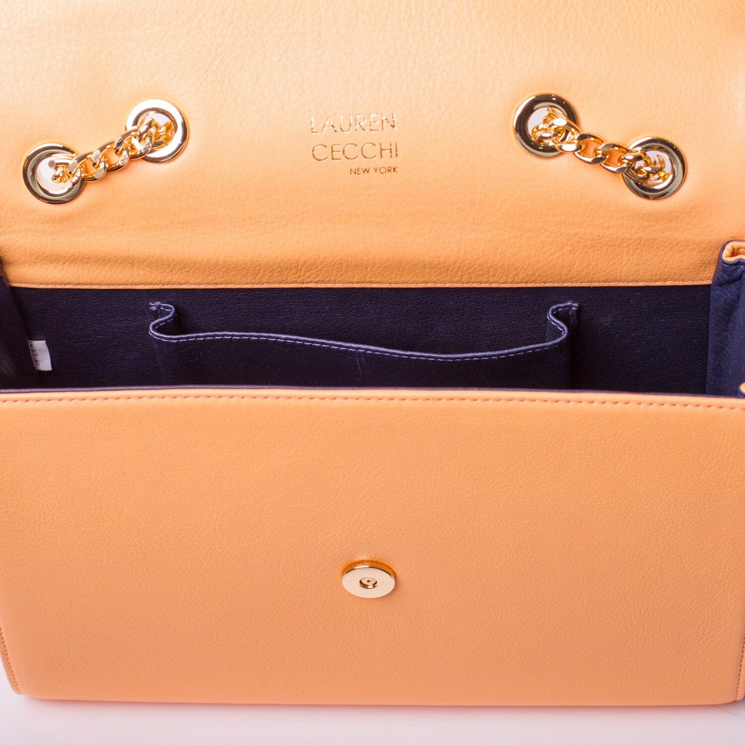 The sun never has to stop shining when you carry the American-made Mezzo by Lauren Cecchi New York in her signature color, Cantaloupe. The bag’s fun, bright hue is comparable to a summer’s day, and it’s soft, cool Italian leather provides the perfect amount of luxurious shade for your outfit. Featuring a 50-inch polished silver double chain and the signature LCNY ribbing, this structured handbag rests weightlessly upon four coordinated metal studs to keep it out of the sand and in your hand.